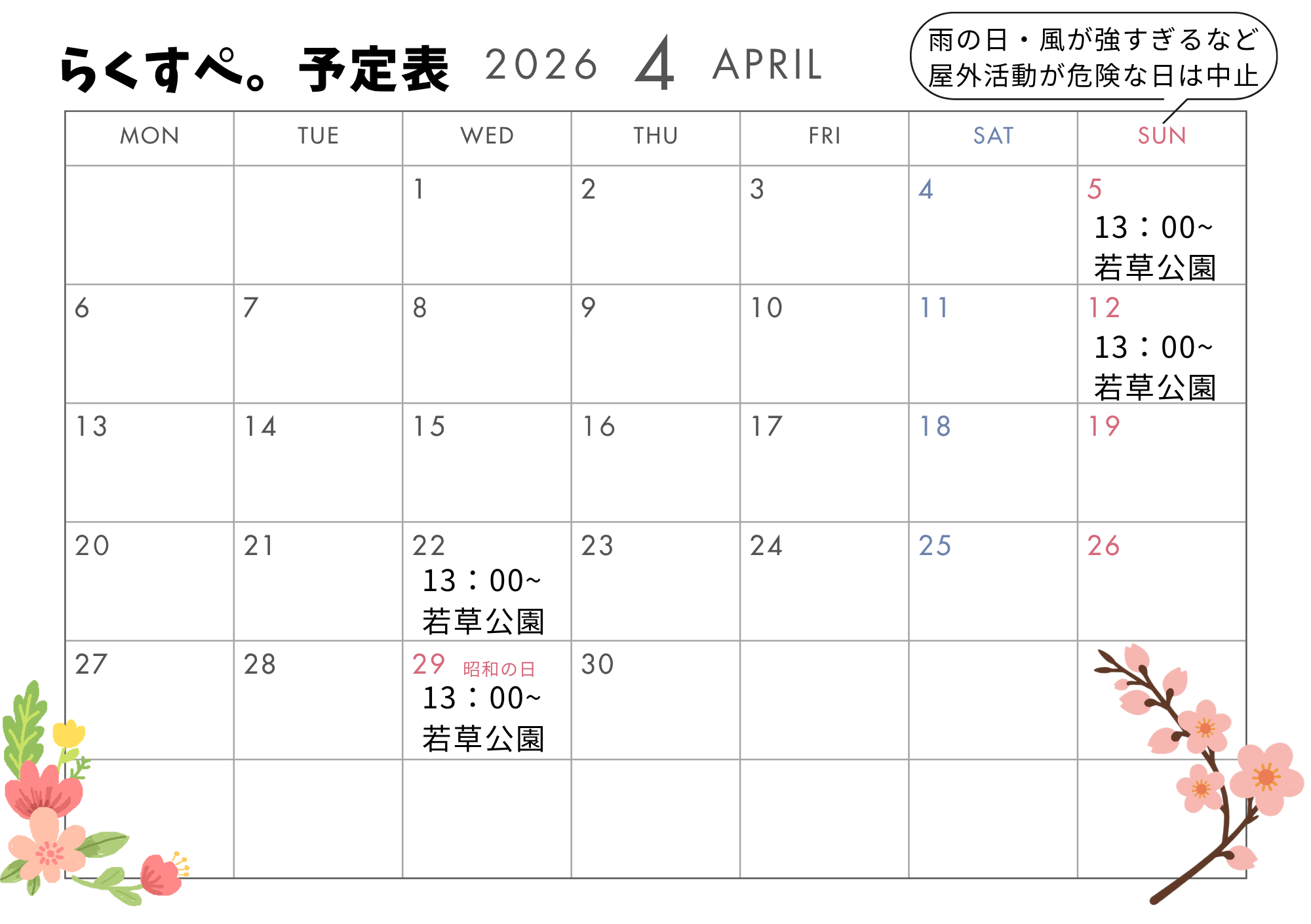 雨の日や風が強いなど、屋外活動が危険な時はお休みします。
